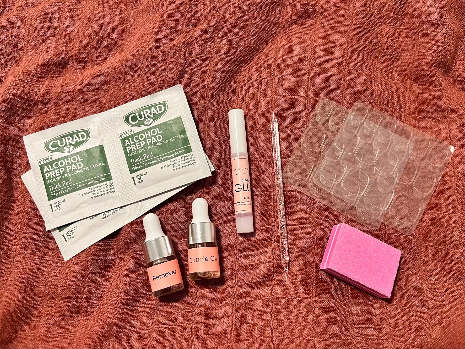 • Nail prep kit (buffer, alcohol pad, nail glue, adhesive tabs, cuticle pusher, cuticle oil, glue remover)