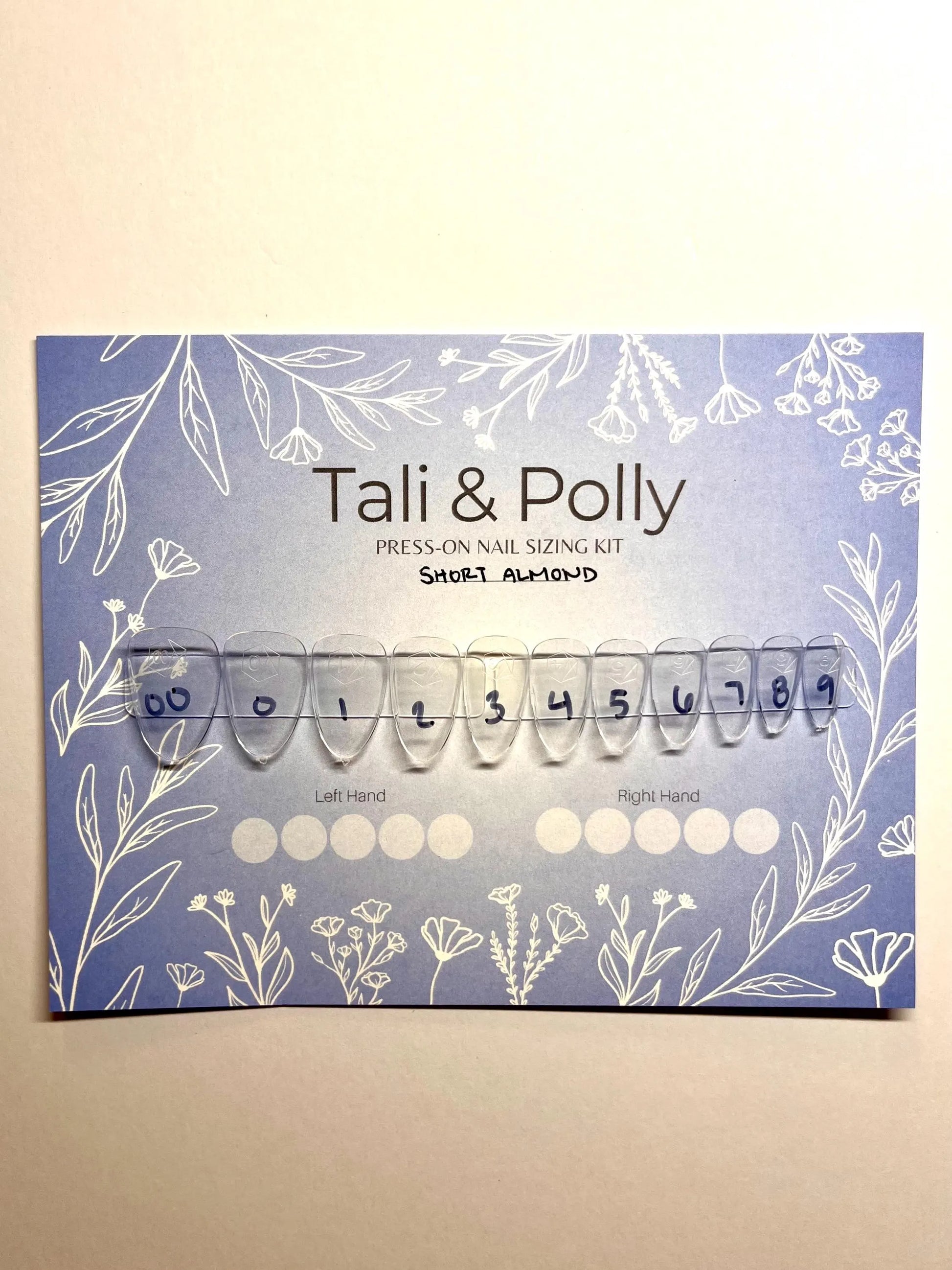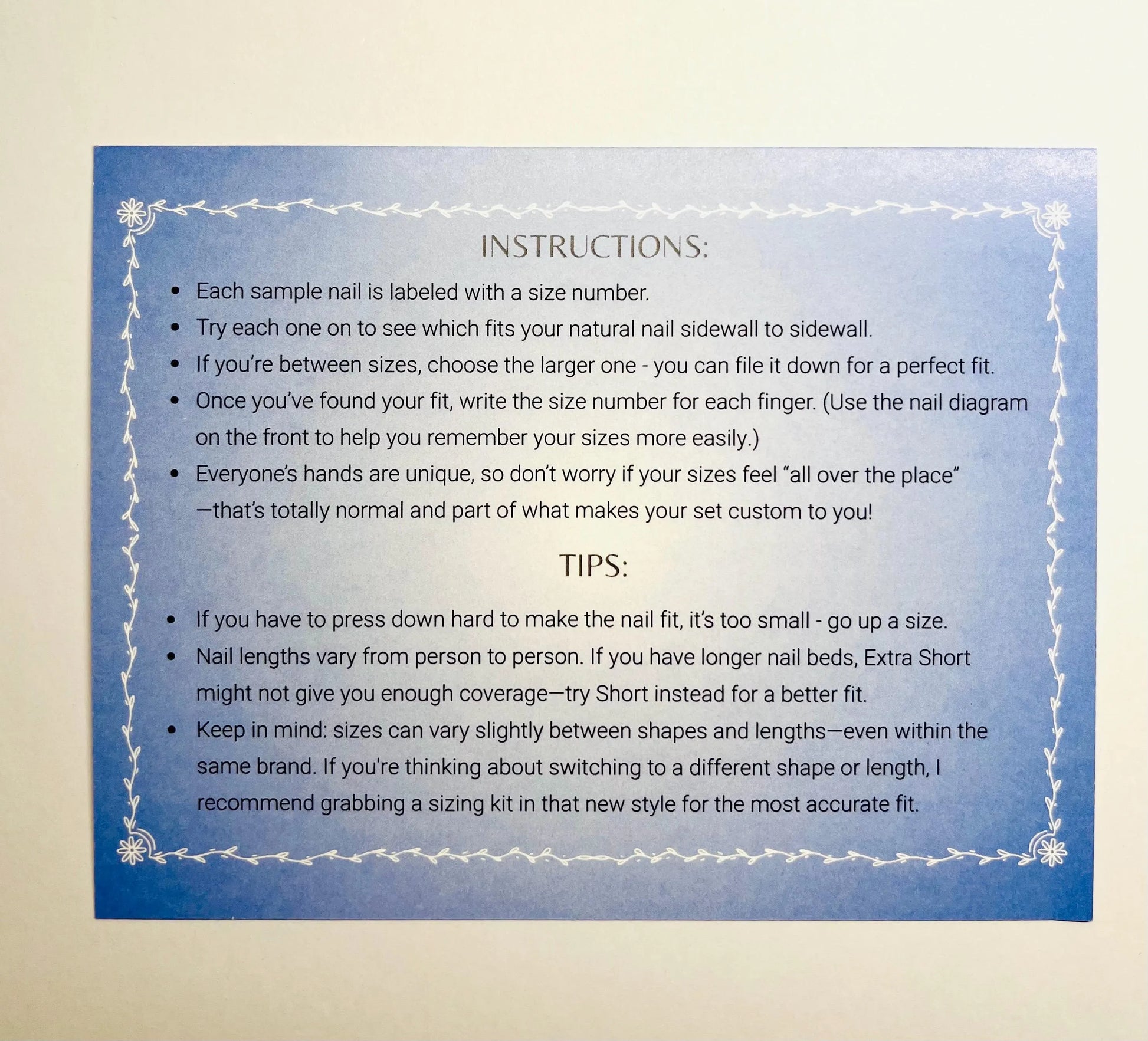 • This sizing kit is specific to my shop and the press-on nails I create. Sizes may not match other shops or brands.